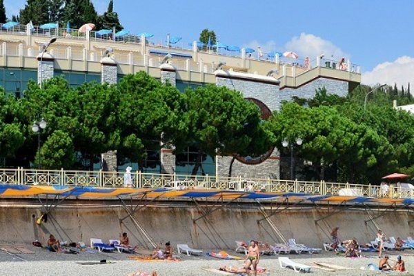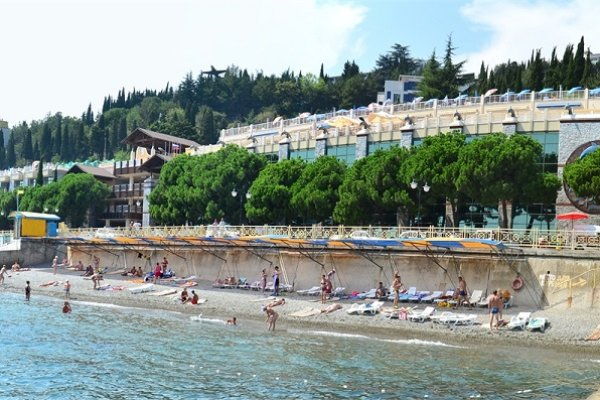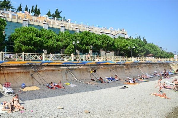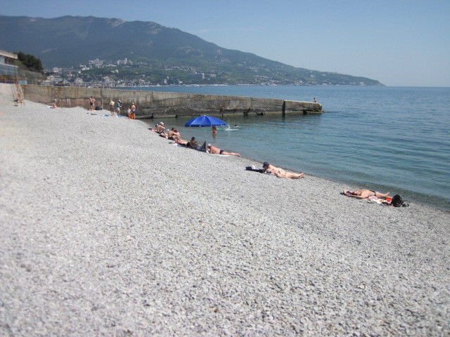 собственный, мелкогалечный, благоустроенный (лежаки, раздевалки, навесы) в 450 м от санатория.