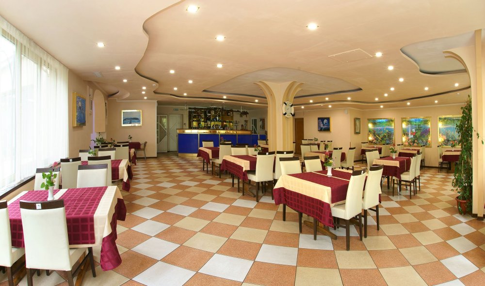 в столовой санатория на 225 мест заказное (3-разовое, по назначению врача — диетическое). Обслуживание — официантами. В номерах 2-к 2-м и Люкс отдельное питание в небольшом уютном кафе (60 мест).