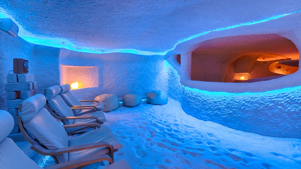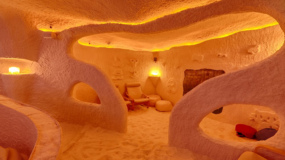 Стены, пол и потолок пещеры выложены блоками из уникальных Солотвинских и Сакских солей, которые содержат комплекс каротиноидов, природный воск, глицерин, органический йод: всего 83 микро- и макроэлемента, полезных для организма человека. Приходите в Соляную пещеру и укрепляйте свой иммунитет!