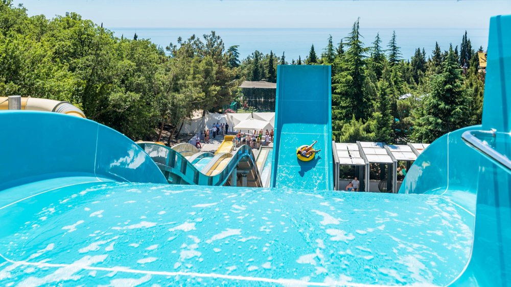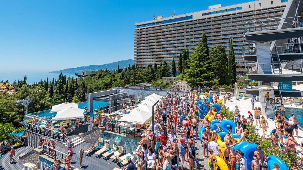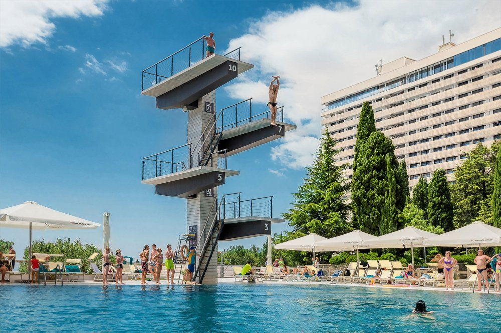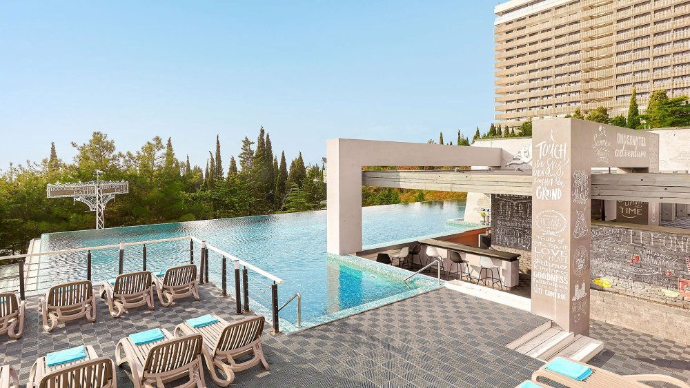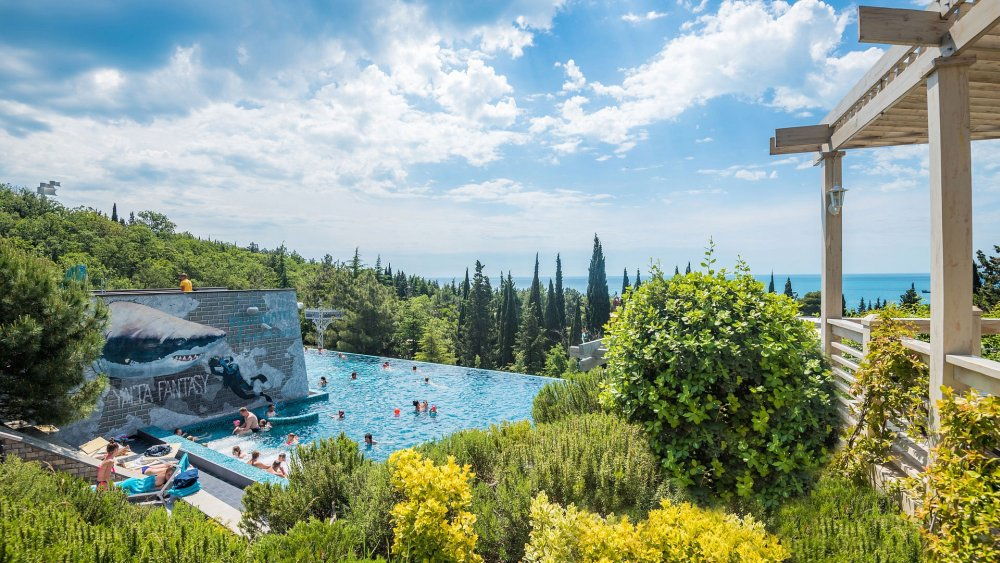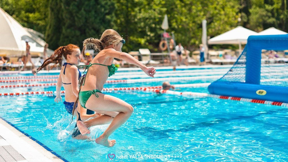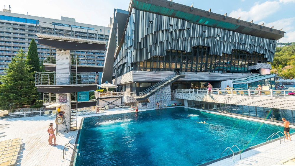 - Крупнейший в Крыму бассейн с подогреваемой морской водой, аквапарк, детский бассейн с водными аттракционами, бассейны для прыжков в воду и панорамный с баром.