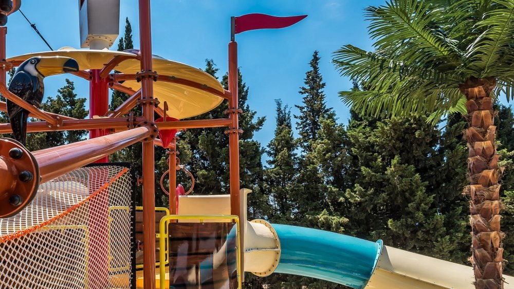 Оборудованная современная площадка с мягкой зеленой травой расположена в нижней части комплекса возле Аквапарка отеля.