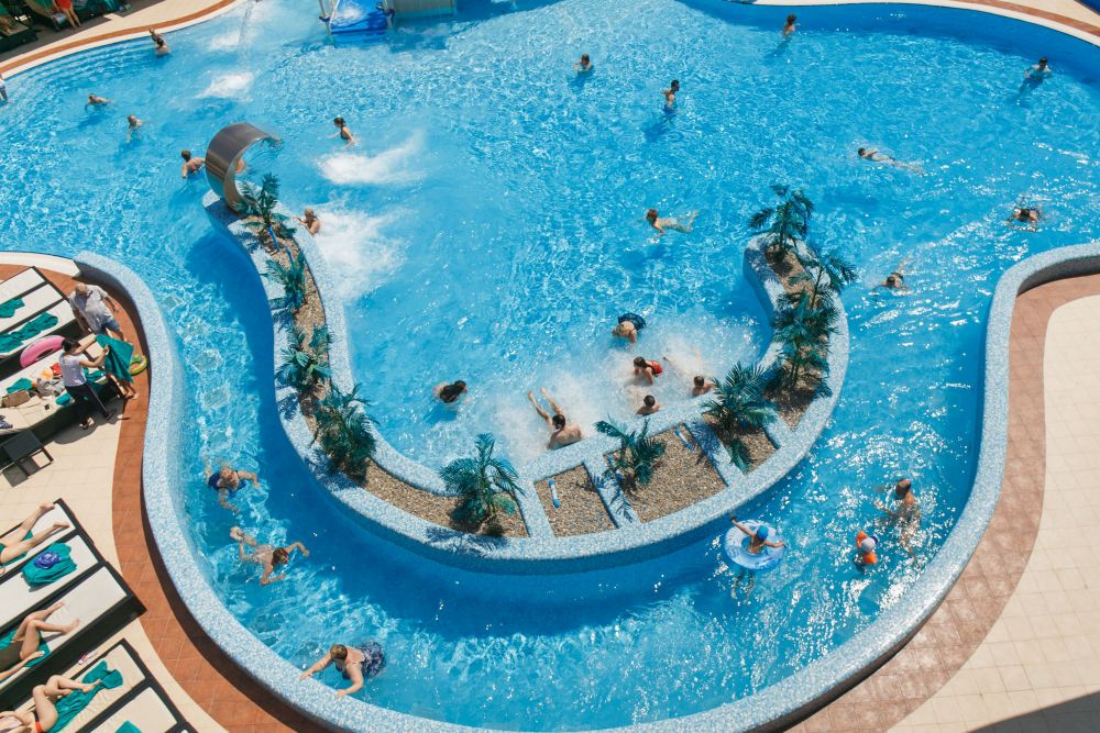 — закрытый бассейн с подогреваемой морской водой (гидромассаж, гейзер, водопад, искусственное течение «быстрая река») (работает круглогодично)
