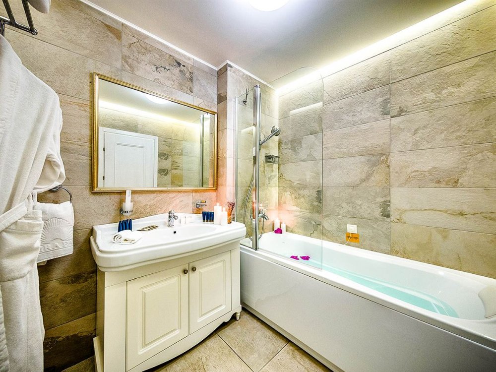 1 уровень – закрытый бассейн с подогреваемой морской водой и центром банных культур: русская паровая баня, турецкий хамам, инфракрасная сауна, японские контрастные купели мраморные македонские троны;