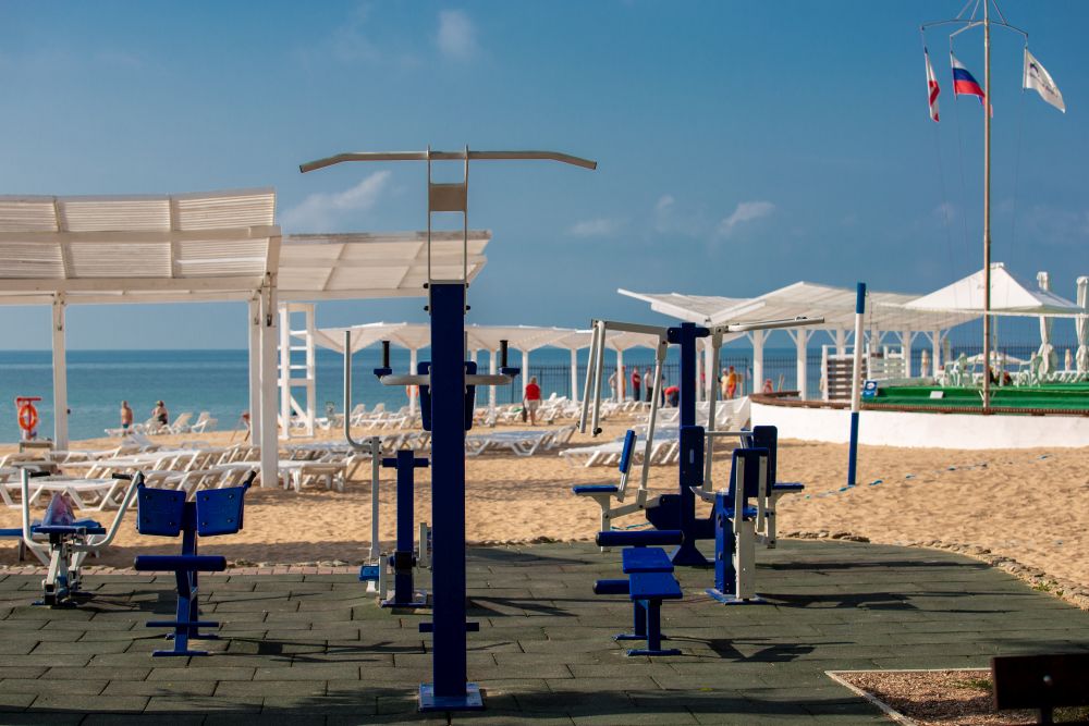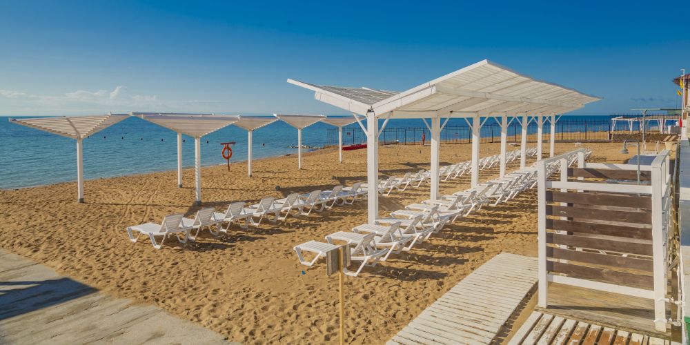 песчаный, собственный, в 50-200 м от корпусов санатория. Имеются навесы, шезлонги, лежаки, летнее кафе, раздевалки, питьевые фонтанчики, душ, туалет. На пляже постоянно дежурит спасатель.