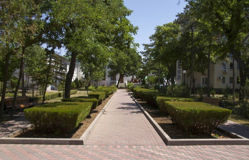 Здравница утопает в зелени: здесь растут кипарисы и крымские сосны, боярышник и дуб, кедр ливанский и можжевельник, гледичии и платаны, земляничное дерево, хурма, гранат, а также – огромные кусты белых роз.  Рядом с санаторием находится: дельфинарий, аквариум, концертный зал «Отдых»  и центральная набережная города Евпатория.