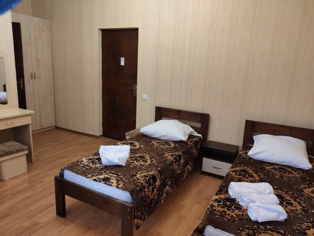 Мебель: вешалка, журнальный столик, односпальные кровати 4 шт.- по 2 в каждом номере, прикроватные тумбочки, трюмо, шкаф.