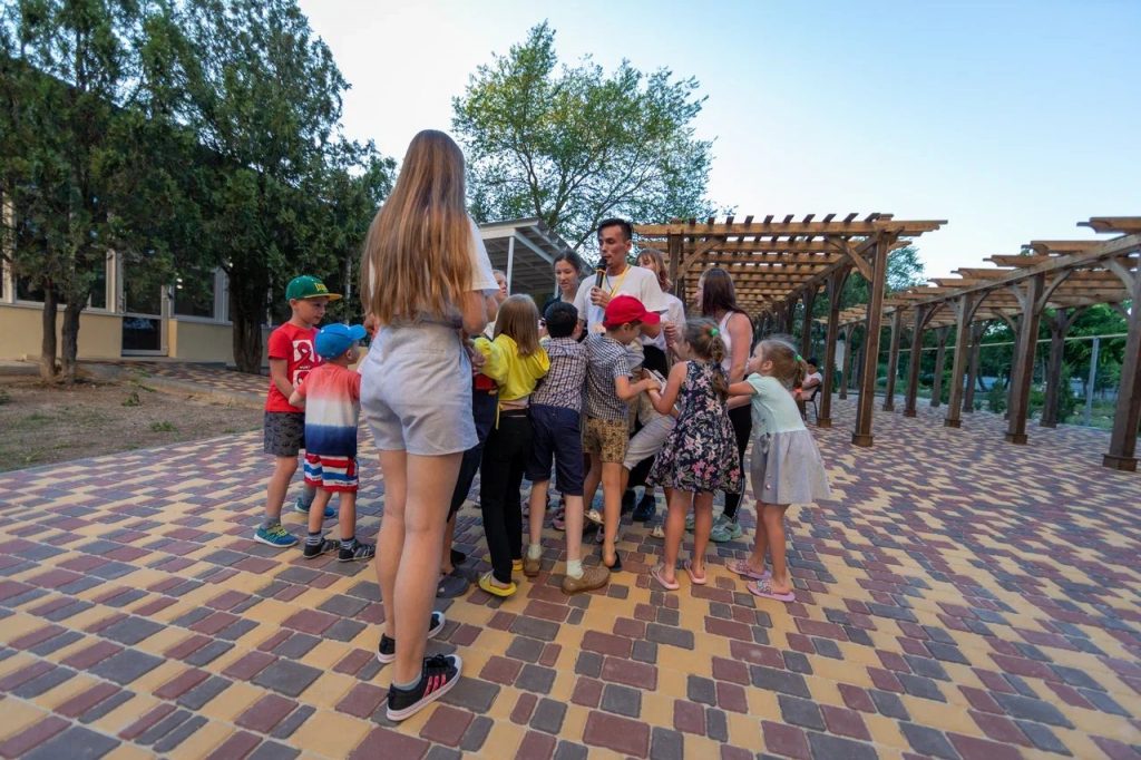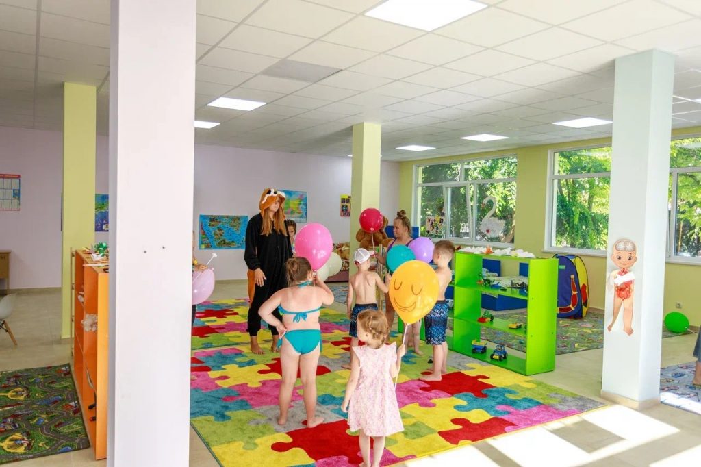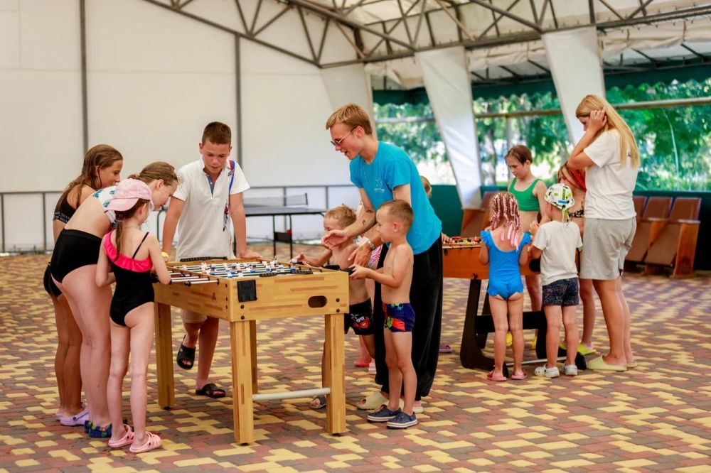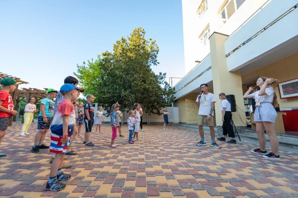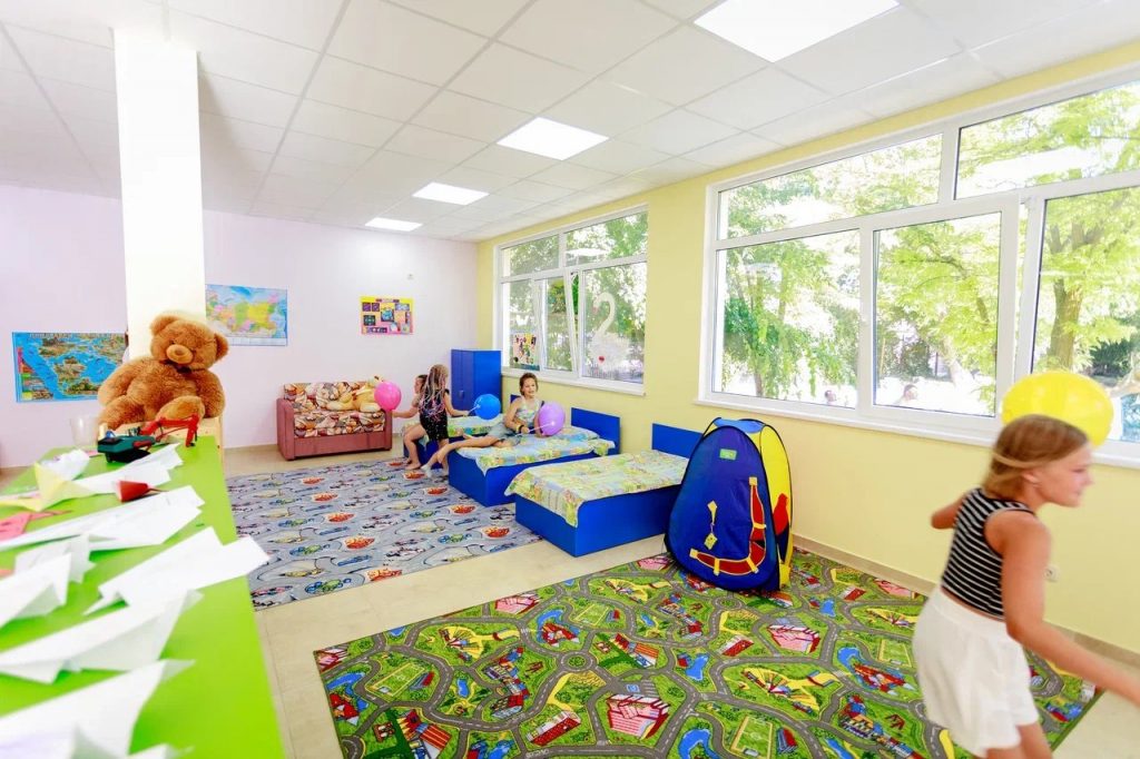 Детский мини-клуб (от 3-х до 12-ти лет) с воспитателем. В отдельном просторном здании находится детский клуб, где собрано большое количество разнообразных игрушек и развивающих игр. В детской комнате находится воспитатель, который под наблюдением родителей проведет с детьми увлекательные мастер-классы, развивающие игры, веселые игры с безопасными красочными модулями. Здесь в отдельном помещении оборудован кинозал с большим экраном и проектором. Для других культмассовых мероприятий есть летний шатёр (размеры 24 м. *12 м.)