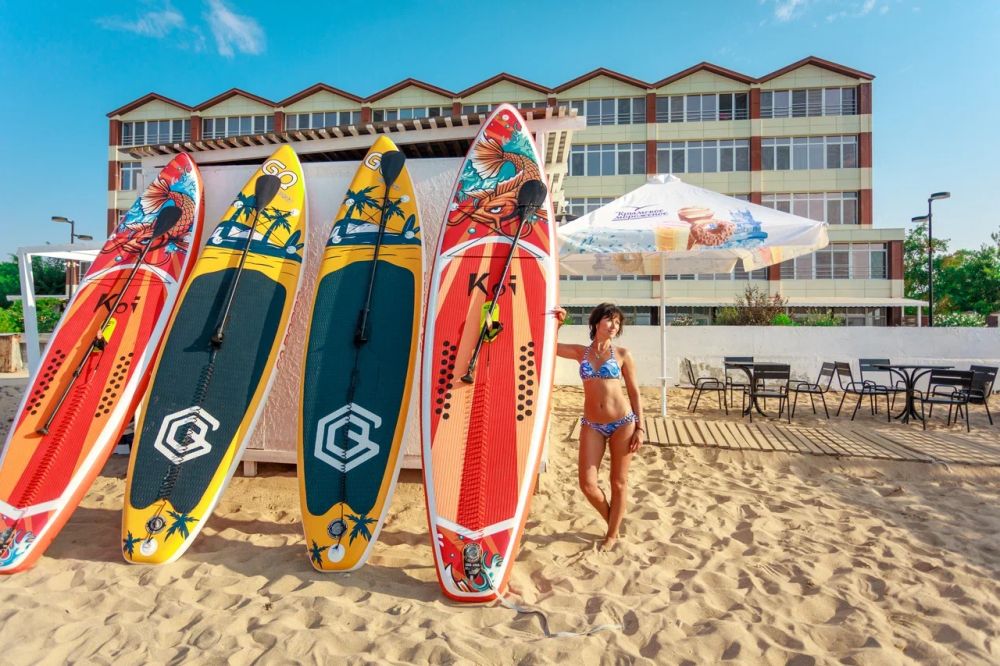 Отдыхали с подругой в июне в этом отеле, впечатления восхитительные. Много где доводилось отдыхать, в Крыму где только не были, но в Евпаторию не ездили, почему-то думали, что там что-то типа Анапы, детский курорт. Сейчас жалеем, что не ездили,в июне народу было мало, море было вначале прохладное, но такого чистого шикарного моря мы не видели нигде. Дно потрясающее, чистое, для любителей плавать с маской самое то. Гостиница уютная, довольно большая, номера ничем не уступают Турции, один в один, всё что нужно есть. Единственный маааленький минус это балкон на два номера разделённый сушилкой, но это особенности постройки и особо нас не напрягало. Очень хороший, вежливый персонал, любая просьба выполнялись мгновенно, мы попросили дополнительные подушки, выдали без вопросов. Кабельное телевидение, вайфай. Всё на отлично.Уборка каждый день, смена белья раз в три дня. В уборной вся сантехника новая, шампкуни, бальзамы. Даже полотенца с вытканными логотипами отеля)) Шведский стол в отдельно стоящем здании, сотрудники дежурят и если что-то заканчивается, тут же приносят новую порцию. Еда разнообразная, есть всё, каши, супы, большой выбор овощей и салатов, вторые и гарнира на любой вкус. Чай, зерновой кофе. На ужин вино. Территория отеля вся благоухает, очень ухоженная, в цветах, есть много локаций для фотозон,приятно даже просто на лавочке посидеть, бассейн на территории, очень понравился, есть мелкое отделение для малышни. Гостиница находится в Санаторном районе, где практически нет жилых домов, одни отели и санатории, народа не очень много, очень спокойно, тихо, набережная огромная, чистая , на пляже для жильцов нашего отеля лежаки бесплатные. Ездили на центральный пляж ,на машине 5 минут, (заказывали такси Максим,150 рублей в среднем по городу),вот там движуха, рестораны, кафешки на любой вкус и кошелёк, музыканты, экскурсии, лебеди!!!прямо в море плавают! Город, как и отель оставил только хорошие впечатления, это единственное место отдыха, откуда не хотелось уезжать. Спасибо огромное персоналу отеля, желаем вам мирного неба, чтобы скорее стабилизировалась обстановка и полетели к вам самолёты, ждите нас обязательно в следующем году. Удачи вам и процветания.