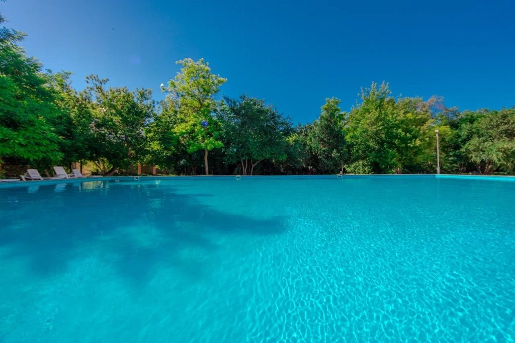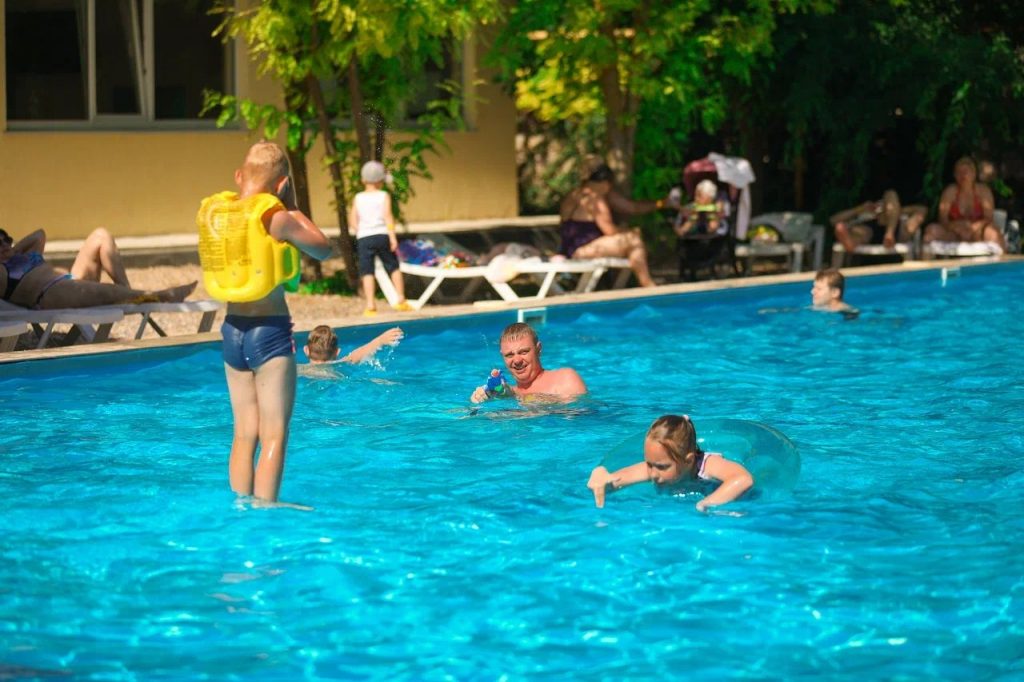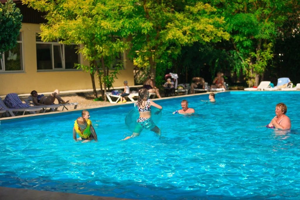 Открытый бассейна. В систему «Все включено» отеля «Family Resort» входит услуга пользования открытым бассейном. Бассейн имеет современную систему отчистки и естественный подогрев. На площадке рядом с бассейном в тени деревьев для гостей предусмотрены зоны отдыха с шезлонгами. Бассейн разделён на три зоны: