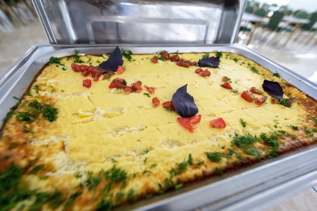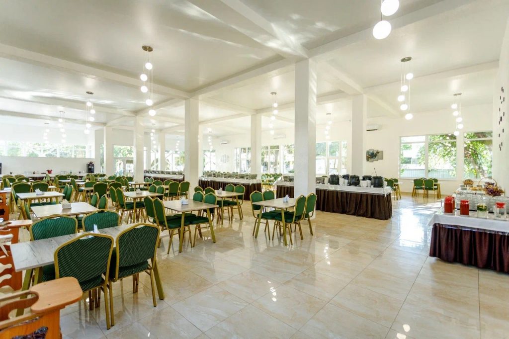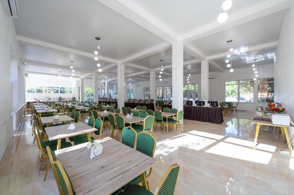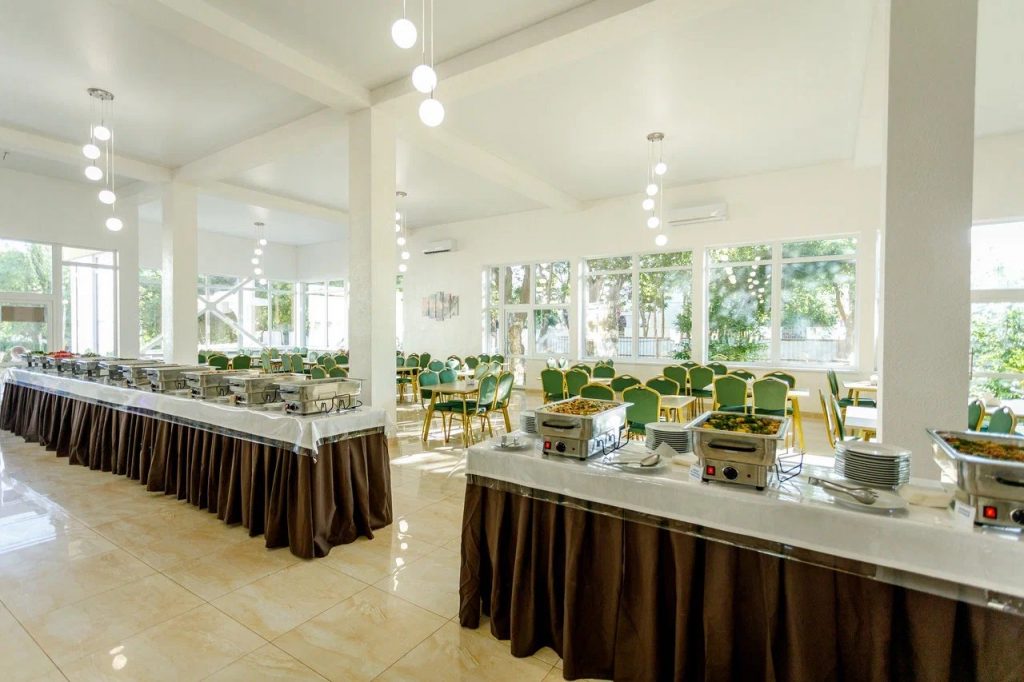 3-разовое питание «Шведский стол». в ресторане, который рассчитан на 250 посадочных мест. В уютной атмосфере проходят завтраки (8:00-10:00), обеды (13:00-15:00) и ужины (18:00-20:00) по системе питания «Шведский стол». Разнообразие горячих блюд и холодных закусок, салатов и гарниров дополнит уютная атмосфера и гостеприимный персонал зала ресторана.