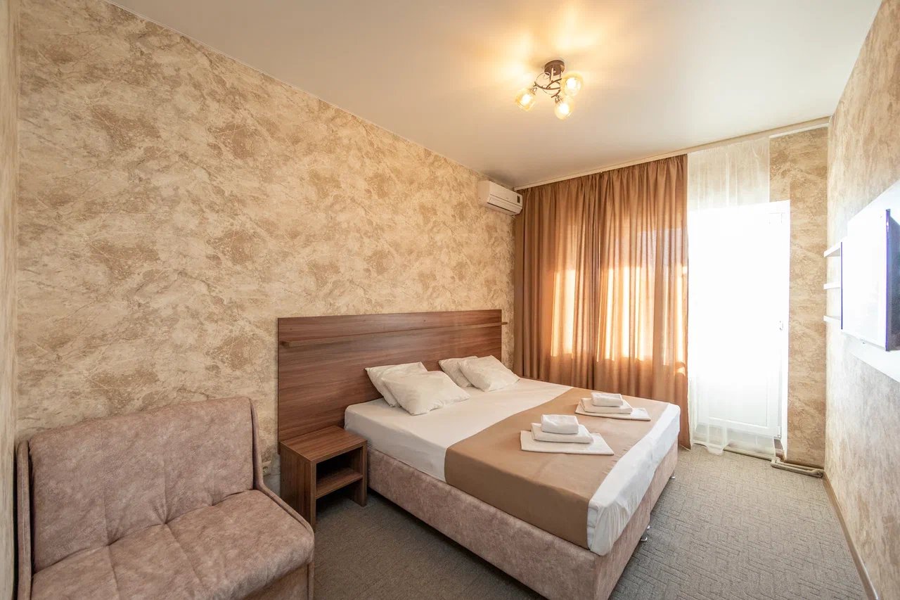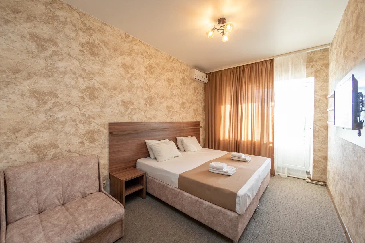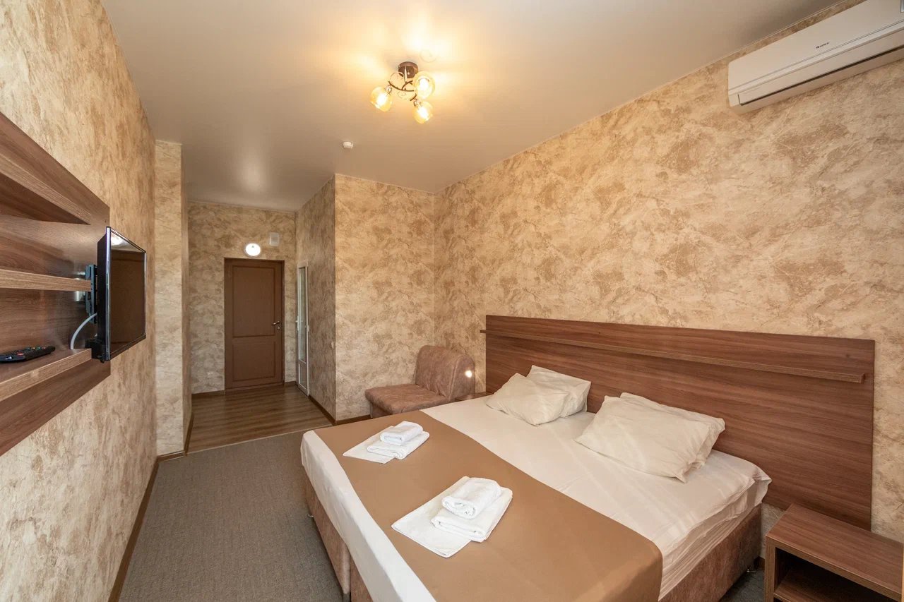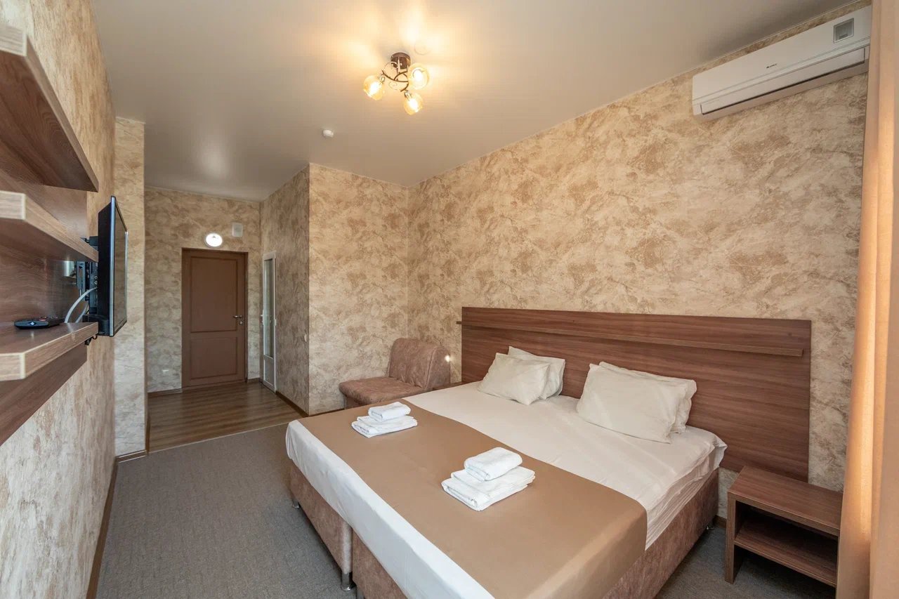Отдыхали с 24.06.21 по 01.07.21, муж, жена и ребёнок 1,3 годика. Ставлю 5 звёзд, так как значительных минусов мы вообще не заметили. Наш номер находился на 4 этаже, есть лифт, заселили быстро, минут за 15, и не в 14.00, а в 13.00 (за это огромное спасибо администратору🤗). Сразу выдали нам браслетики на питание в парк отеле Романова. Кормят сразу скажу «на убой», на завтрак всегда каши, омлет, котлеты, мясная и сырная нарезки, овощи, сосиски и сардельки, на обед супы и гарниры, большой ассортимент мяса и салатов,всегда есть свежая выпечка, ужин тоже отличный. Хочу уточнить, что тех, кто приезжает по социальным путевкам кормят на территории отеля в шатре, а кто, как мы, питание шведский стол в отеле Романова. Также на территории отличный бассейн, каждое утро приходил парень, который очищает воду, вода в бассейне тёплая и чистая, рядом стоят лежаки, народу в бассейне не много. Ночью всегда тихо, слышимость в отеле средняя, вроде слышно, но ни как не мешает, это при том, что дочка спит чутко, она ни разу за ночь не просыпалась от посторонних звуков. Для дочки нам предоставили деревянную кроватку. Каждый день уборка, прибирали так себе, полотенце в ванной комнате не всегда меняли, а оно от влажности совсем не сохло, постельное белье за неделю поменяли один раз, вполне хватило. На балконе стоит сушилка для белья, но нет стульчиков, только в номере, приходилось выносить каждый раз. Кровать была двухспальная, не скрипучая, ремонт в номере на твёрдую 4+. Слабовата сантехника. Есть холодильник, только фена не хватало. До пляжа минут 5 спокойным шагом, ещё бы было хорошо, если бы пляж лучше прибирали, мусора много, окурки, палочки, пластмасса попадаются, а так всё отлично, лежаки всегда были.