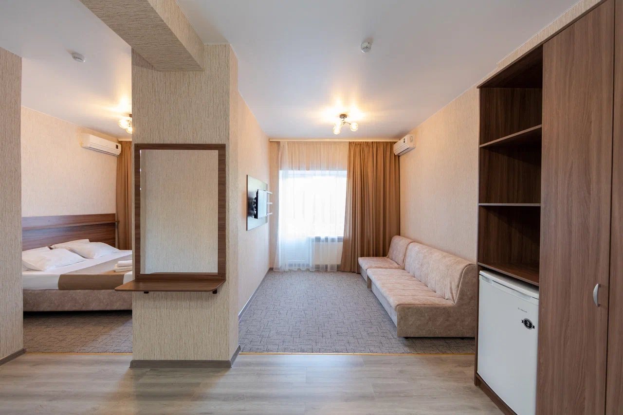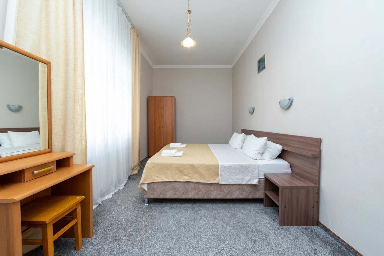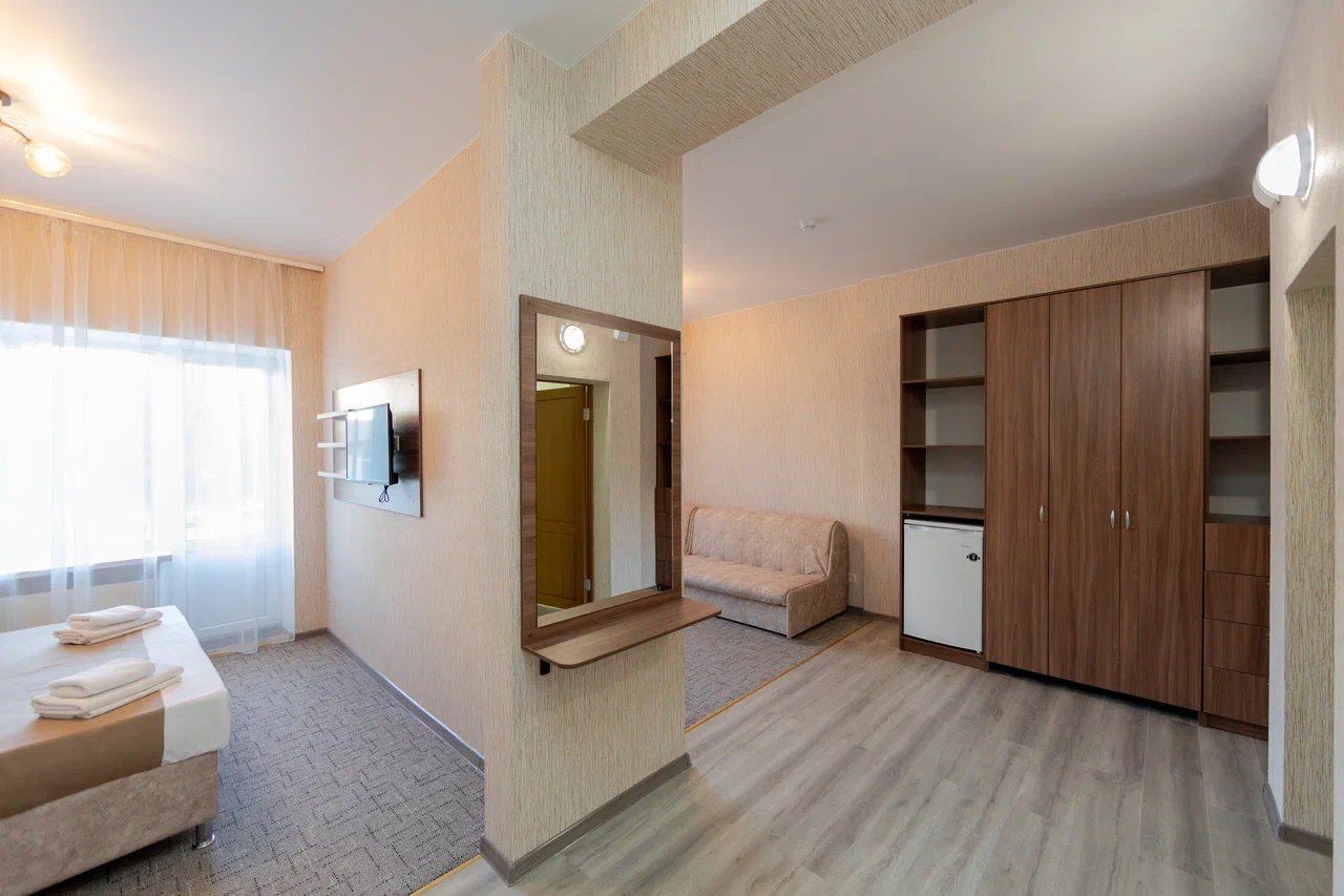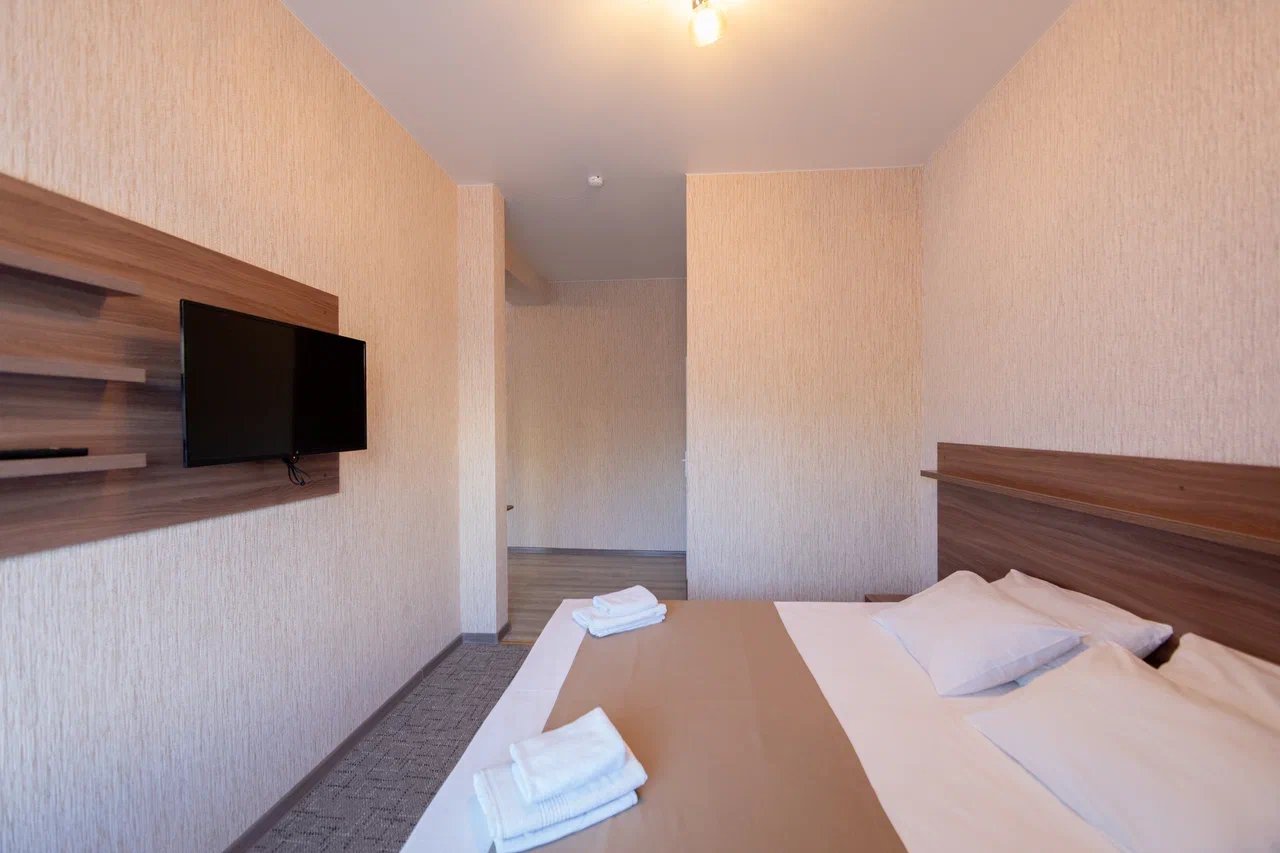 Отдыхали с 24.06.21 по 01.07.21, муж, жена и ребёнок 1,3 годика. Ставлю 5 звёзд, так как значительных минусов мы вообще не заметили. Наш номер находился на 4 этаже, есть лифт, заселили быстро, минут за 15, и не в 14.00, а в 13.00 (за это огромное спасибо администратору🤗). Сразу выдали нам браслетики на питание в парк отеле Романова. Кормят сразу скажу «на убой», на завтрак всегда каши, омлет, котлеты, мясная и сырная нарезки, овощи, сосиски и сардельки, на обед супы и гарниры, большой ассортимент мяса и салатов,всегда есть свежая выпечка, ужин тоже отличный. Хочу уточнить, что тех, кто приезжает по социальным путевкам кормят на территории отеля в шатре, а кто, как мы, питание шведский стол в отеле Романова. Также на территории отличный бассейн, каждое утро приходил парень, который очищает воду, вода в бассейне тёплая и чистая, рядом стоят лежаки, народу в бассейне не много. Ночью всегда тихо, слышимость в отеле средняя, вроде слышно, но ни как не мешает, это при том, что дочка спит чутко, она ни разу за ночь не просыпалась от посторонних звуков. Для дочки нам предоставили деревянную кроватку. Каждый день уборка, прибирали так себе, полотенце в ванной комнате не всегда меняли, а оно от влажности совсем не сохло, постельное белье за неделю поменяли один раз, вполне хватило. На балконе стоит сушилка для белья, но нет стульчиков, только в номере, приходилось выносить каждый раз. Кровать была двухспальная, не скрипучая, ремонт в номере на твёрдую 4+. Слабовата сантехника. Есть холодильник, только фена не хватало. До пляжа минут 5 спокойным шагом, ещё бы было хорошо, если бы пляж лучше прибирали, мусора много, окурки, палочки, пластмасса попадаются, а так всё отлично, лежаки всегда были.