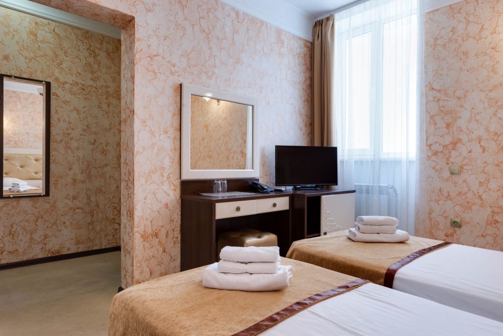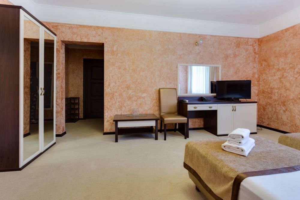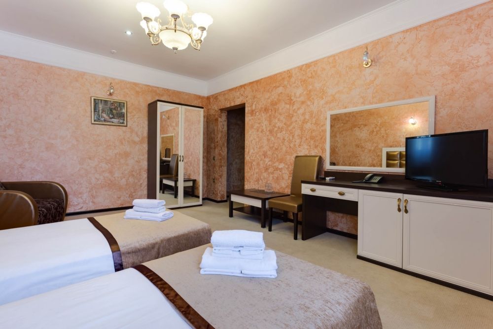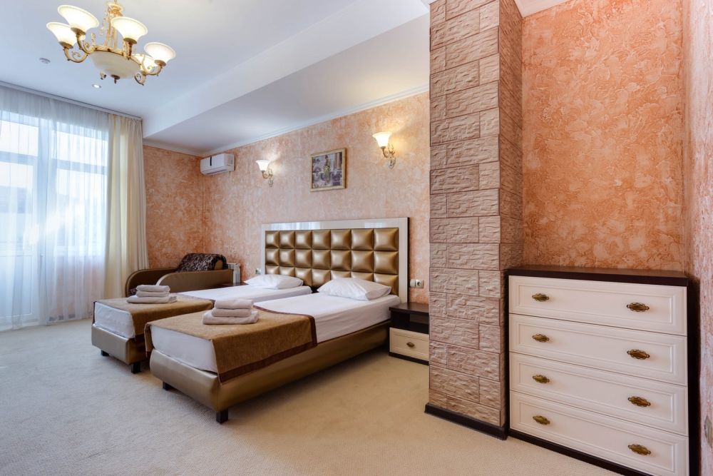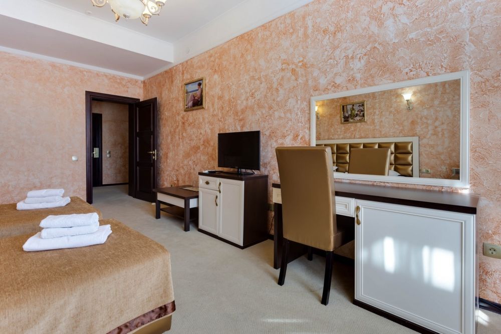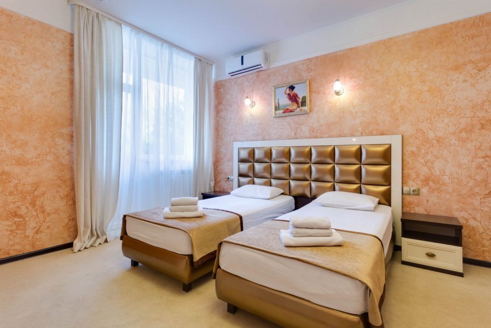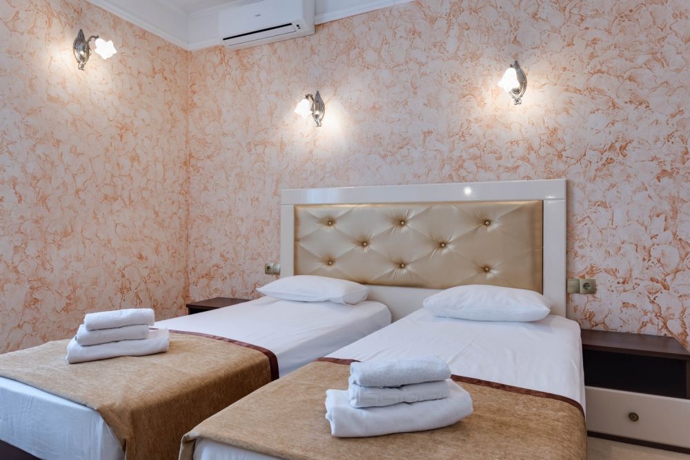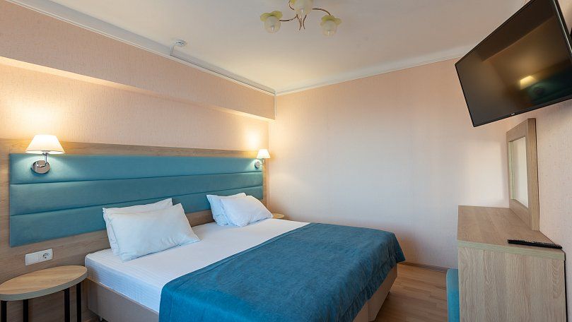 Останавливались в стандарте на неделю. Отель очень приятный, необычный античный антураж персонал вежливый и приветливый, стараются сразу учесть все просьбы. Номер чистый светлый, минимальный набор для жизни есть) правда очень маленькая ванна с тесной душевой, но в целом нормально. Еда стандартный шведский стол, можно подобрать по вкусу. Автобус возит на супер пляж лазурный берег, реально супер море, для деток просто рай. Можно сходить на городской пляж, на набережную вечером- минут 15 пешком. Бассейн чистый ухоженный, есть ванна для маленьких и глубокая. По расписанию работают аниматоры . Есть детская площадка на улице и игровая комната. Есть спортзал.В целом понравилось)