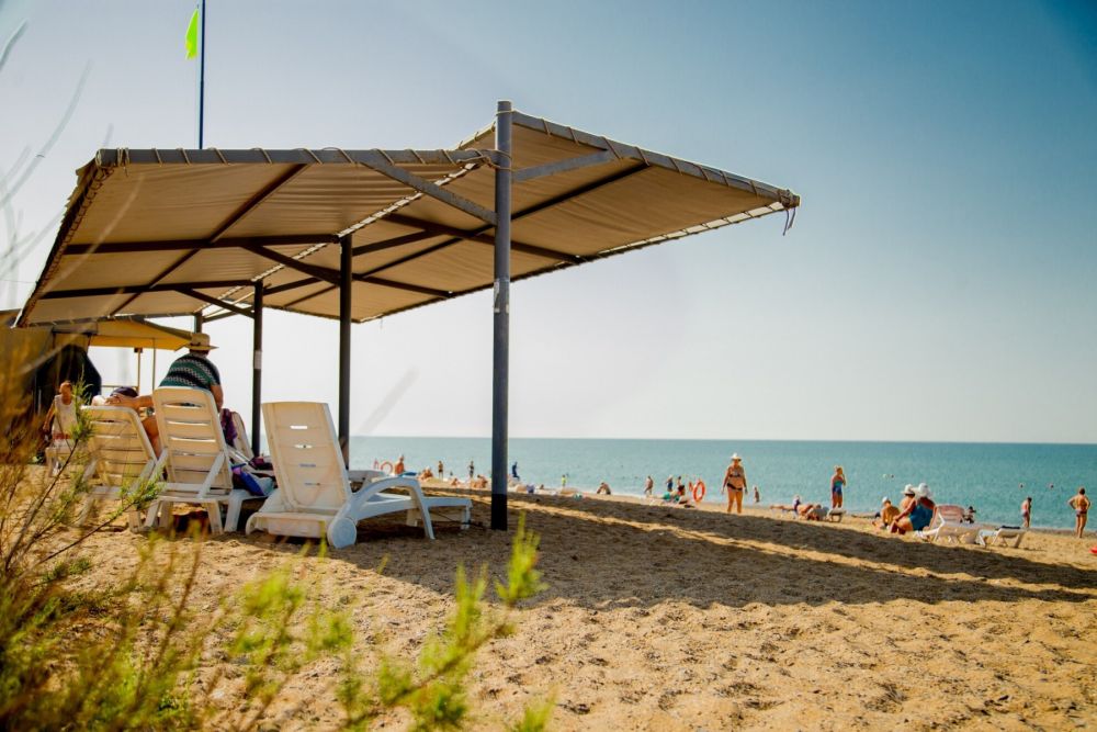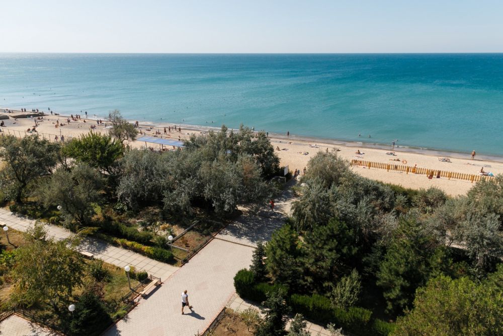 Собственный песчано-галечный в 50-150 м от корпусов, оборудован теневыми навесами, шезлонгами, душевыми, раздевалками. В летнее время на пляже проводятся анимационные и спортивные мероприятия.